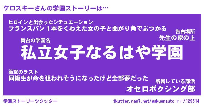 | ヒーロー風カッコイイあだ名 | 『スーパーケロスキー』『天弓騎士ケロ』 |
