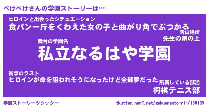 | 女子向けラノベタイトル風あだ名 | 『(仮)ぺけぺけのやんごとなき事情』 |