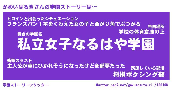 | 女子向けラノベタイトル風あだ名 | 『かめいはるき姫と円卓の騎士』 |