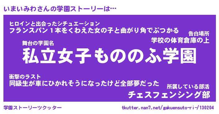 | 男性向けラノベタイトル風あだ名 | 『イマイミワアートオンライン』 |