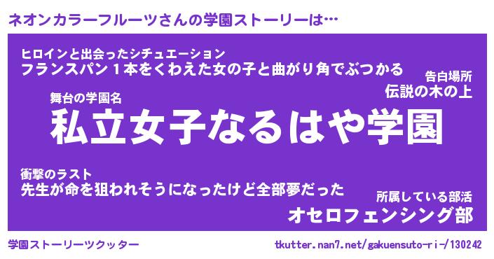 | 女子向けラノベタイトル風あだ名 | 『ネオンカラーフルーツ姫と円卓の騎士』 |