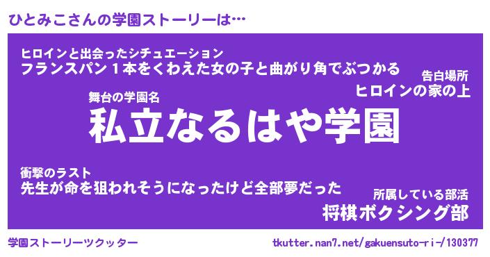 | 告白場所 先生の家の上 …「ふぃぎゅこ」 | 2月17日 06:24 |