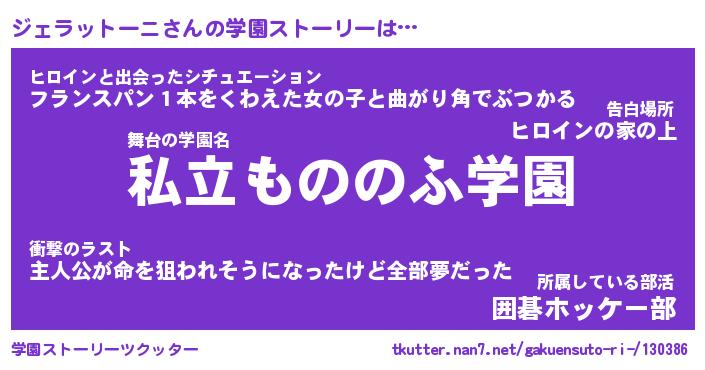 | 女子向けラノベタイトル風あだ名 | 『(仮)ジェラットーニのやんごとなき事情』 |