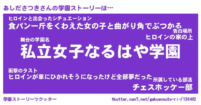 | 男性向けラノベタイトル風あだ名 | 『アシダサツキアートオンライン』 |