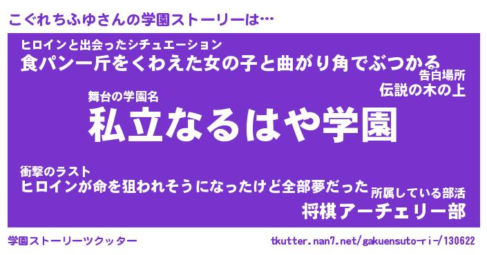 | 伝説のあだ名 | 『伝説のスナイパーこぐれちふゆ』 |
