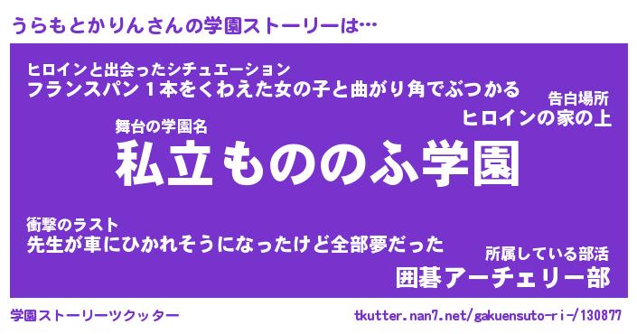 | 男性向けラノベタイトル風あだ名 | 『うらもとかりんの憂鬱』 |