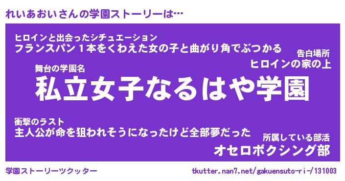 | ファンタジー風あだ名 | 『レイフェル』『エターナルレイアオイー』 |