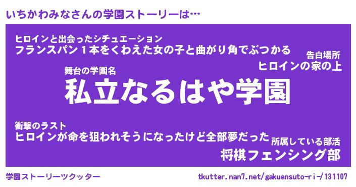 | ヒーロー風カッコイイあだ名 | 『スーパーイチカワミナ』『天弓騎士イチ』 |