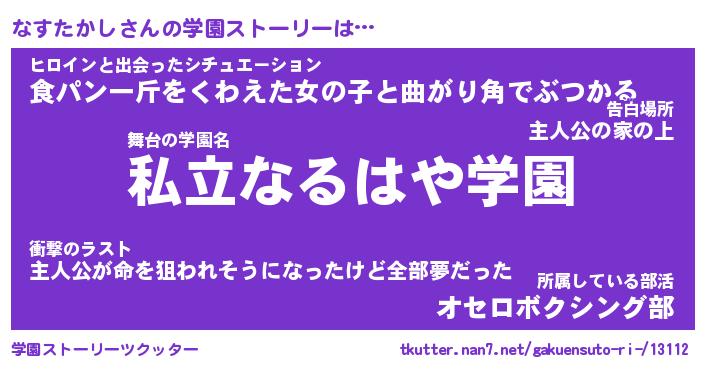 | 男性向けラノベタイトル風あだ名 | 『なすたかしの憂鬱』 |