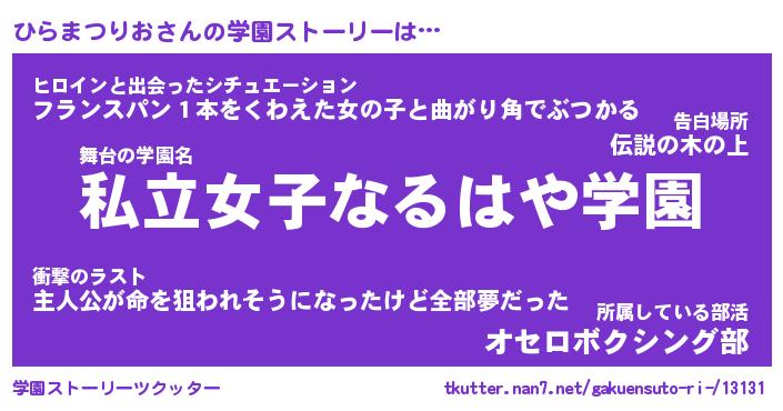 | ヒーロー風カッコイイあだ名 | 『スーパーヒラマツリオ』『天弓騎士ヒラ』 |