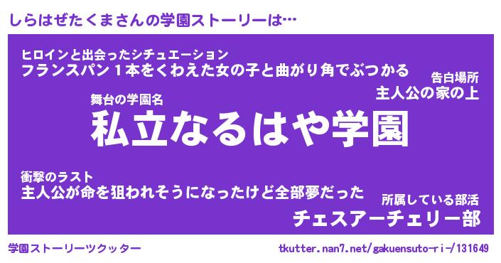 | 女子向けラノベタイトル風あだ名 | 『(仮)しらはぜたくまのやんごとなき事情』 |