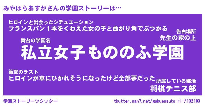 | 男性向けラノベタイトル風あだ名 | 『ミヤハラアスカアートオンライン』 |