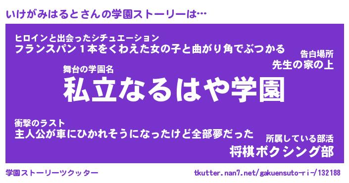 | 男性向けラノベタイトル風あだ名 | 『いけがみはるとの憂鬱』 |
