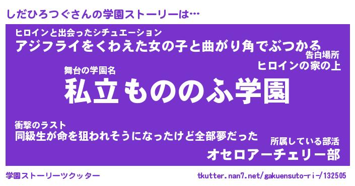 | 女子向けラノベタイトル風あだ名 | 『(仮)しだひろつぐのやんごとなき事情』 |