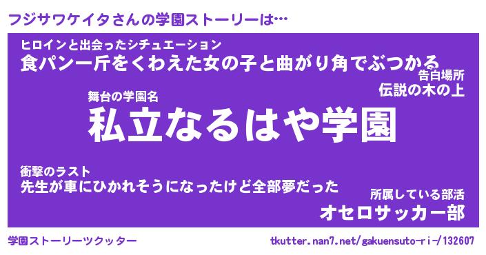 | 男性向けラノベタイトル風あだ名 | 『フジサワケイタの憂鬱』 |