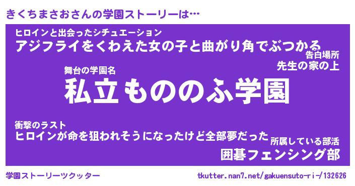 | ヒーロー風カッコイイあだ名 | 『スーパーキクチマサオ』『天弓騎士キク』 |