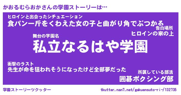 | 女子向けラノベタイトル風あだ名 | 『(仮)かおるむらおかのやんごとなき事情』 |