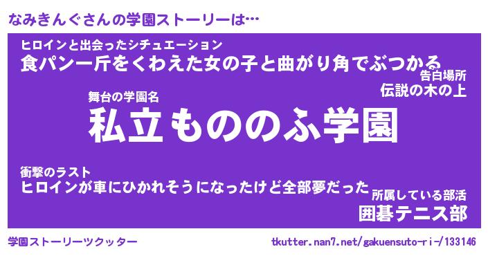 | 男性向けラノベタイトル風あだ名 | 『なみきんぐの憂鬱』 |