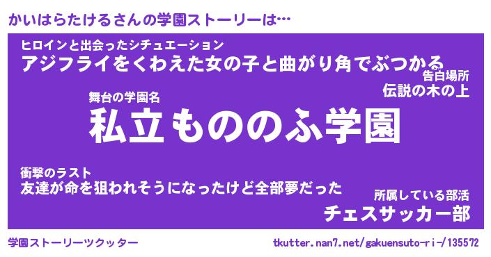 | 男性向けラノベタイトル風あだ名 | 『かいはらたけるの憂鬱』 |