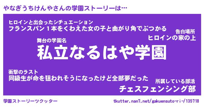 | 女子向けラノベタイトル風あだ名 | 『(仮)やなぎうちけんやのやんごとなき事情』 |