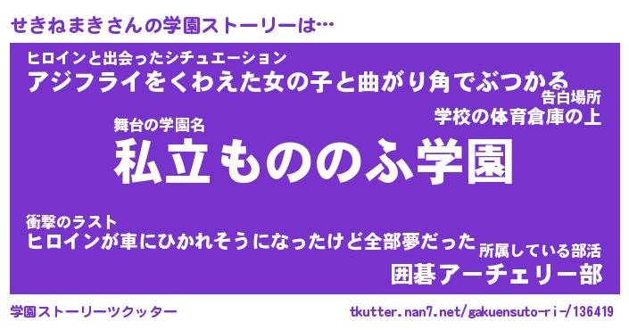 | 男性向けラノベタイトル風あだ名 | 『せきねまきの憂鬱』 |