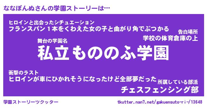 | 男性向けラノベタイトル風あだ名 | 『ななぽんぬの憂鬱』 |