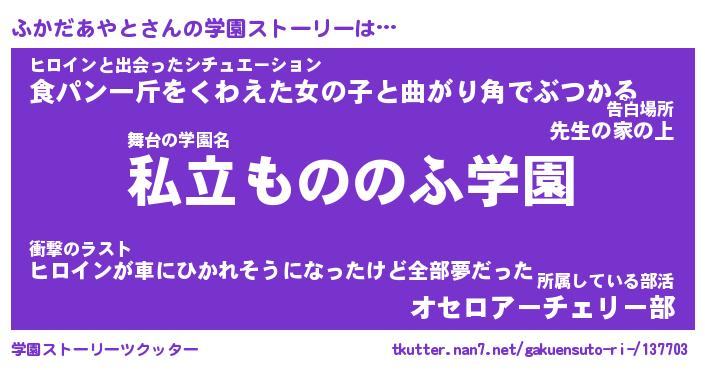 | 男性向けラノベタイトル風あだ名 | 『ふかだあやとの憂鬱』 |