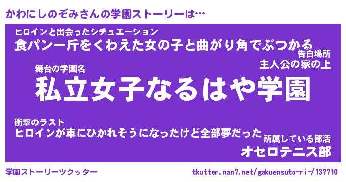 | 男性向けラノベタイトル風あだ名 | 『カワニシノゾミアートオンライン』 |