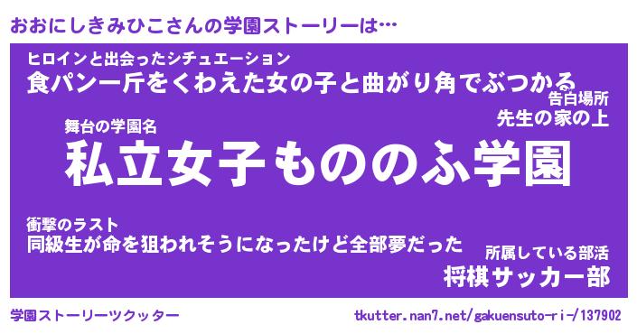 | 女子向けラノベタイトル風あだ名 | 『誰かこのおおにしきみひこを説明してください! ~契約から始まるウェディング~』 |