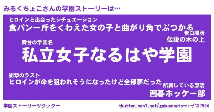 | 女子向けラノベタイトル風あだ名 | 『誰かこのみるくちょこを説明してください! ~契約から始まるウェディング~』 |