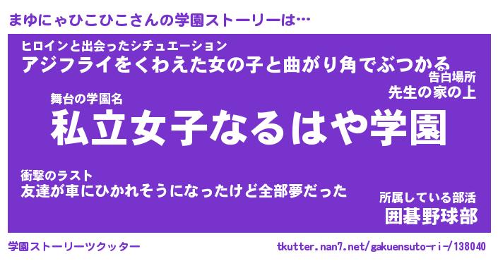 | 肩書あだ名 | 『まゆにゃひこひこ御曹司』 |