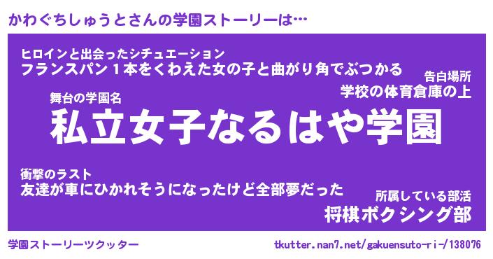 | 女子向けラノベタイトル風あだ名 | 『かわぐちしゅうと姫と円卓の騎士』 |