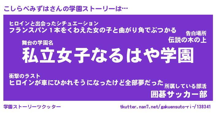 | 女子向けラノベタイトル風あだ名 | 『こしらべみずは姫と円卓の騎士』 |