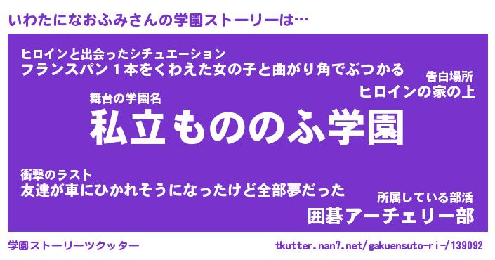 | 女子向けラノベタイトル風あだ名 | 『(仮)いわたになおふみのやんごとなき事情』 |