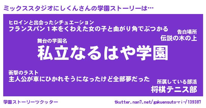| 肩書あだ名 | 『ミックススタジオにしくん御曹司』 |