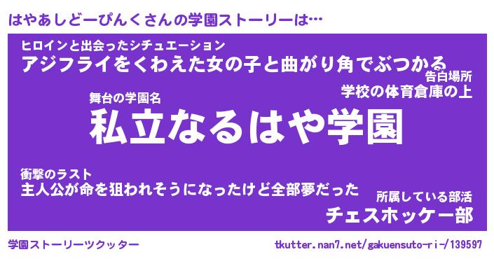 | 女子向けラノベタイトル風あだ名 | 『(仮)はやあしどーぴんくのやんごとなき事情』 |