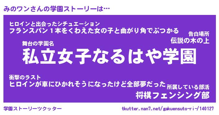 | 女子向けラノベタイトル風あだ名 | 『みのワン姫と円卓の騎士』 |