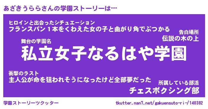 | 女子向けラノベタイトル風あだ名 | 『あざきうらら姫と円卓の騎士』 |