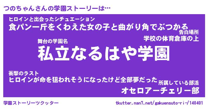 | 男性向けラノベタイトル風あだ名 | 『つのちゃんの憂鬱』 |