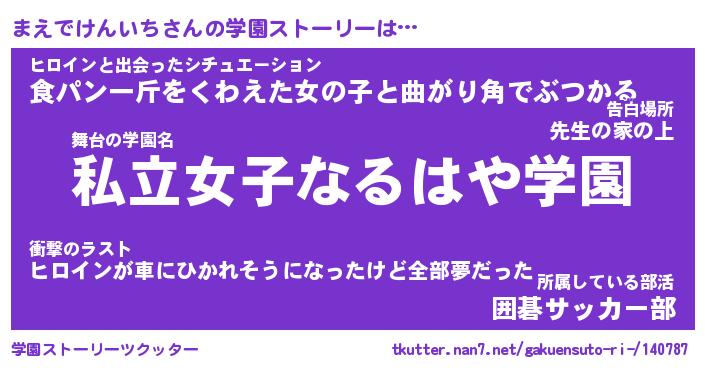 | 伝説のあだ名 | 『封印されしスナイパーまえでけんいち』 |