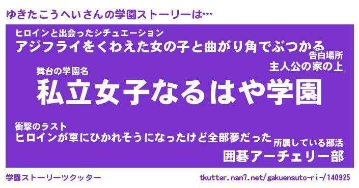 | 女子向けラノベタイトル風あだ名 | 『ゆきたこうへい姫と円卓の騎士』 |