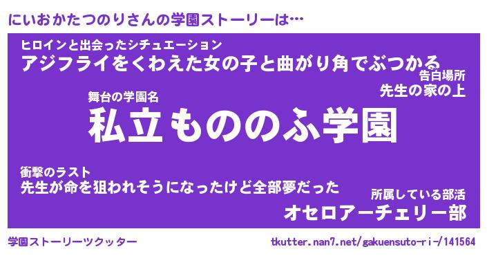 | 男性向けラノベタイトル風あだ名 | 『にいおかたつのりの憂鬱』 |