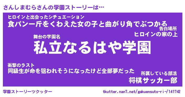 | 男性向けラノベタイトル風あだ名 | 『さんしまむらの憂鬱』 |