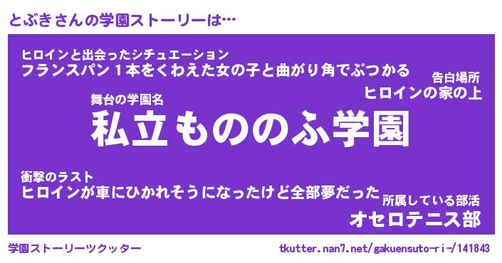 | 女子向けラノベタイトル風あだ名 | 『(仮)とぶきのやんごとなき事情』 |