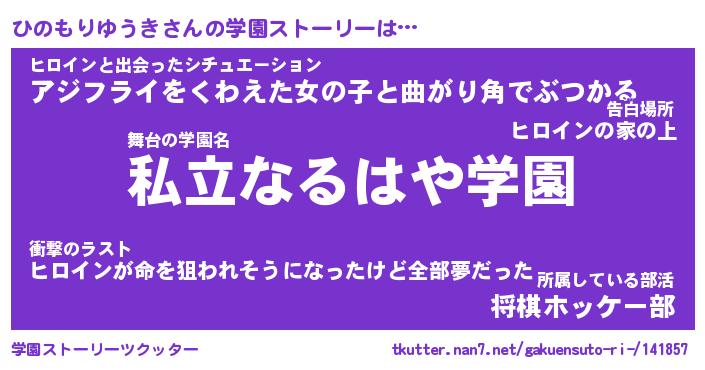 | 女子向けラノベタイトル風あだ名 | 『(仮)ひのもりゆうきのやんごとなき事情』 |