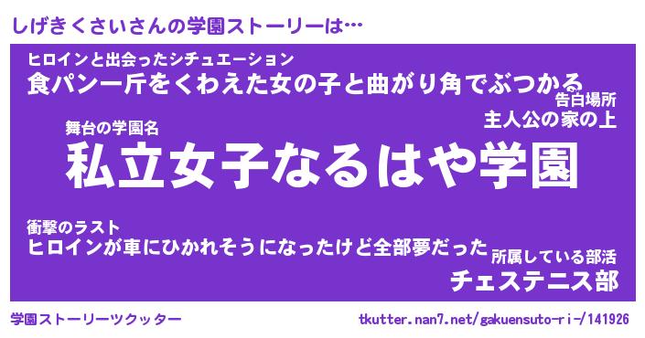 | ヘコむあだ名 | 『しげもー』『つくし』『しげっ子』 |