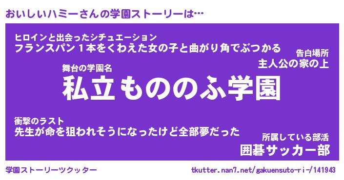 | 男性向けラノベタイトル風あだ名 | 『おいしいハミーの憂鬱』 |