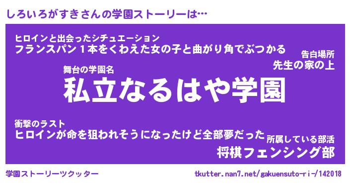 | 女子向けラノベタイトル風あだ名 | 『しろいろがすき姫と円卓の騎士』 |