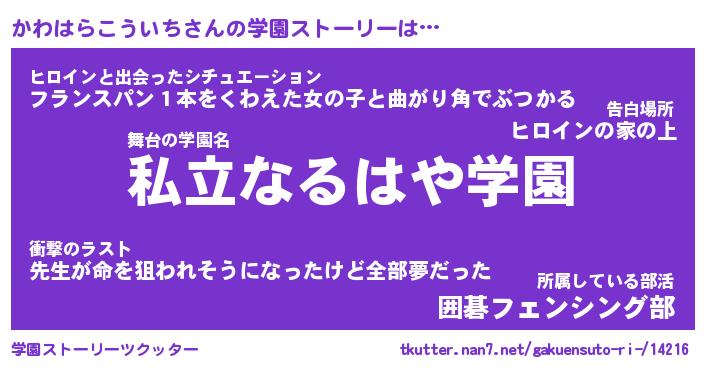 | 女子向けラノベタイトル風あだ名 | 『(仮)かわはらこういちのやんごとなき事情』 |