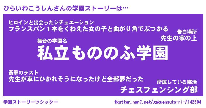 | 女子向けラノベタイトル風あだ名 | 『(仮)ひらいわこうしんのやんごとなき事情』 |